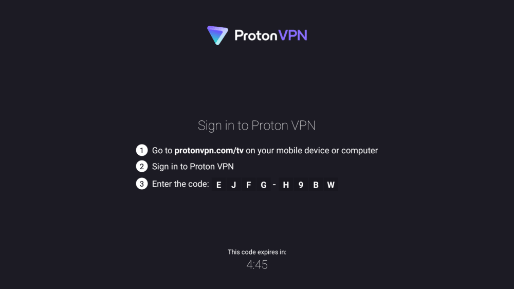 To sign in using this code, grab another device (smartphone or laptop) and go to https://protonvpn.com/tv. Enter your username and password to sign in. Enter the 8-digit code from your TV screen, then select Verify code.