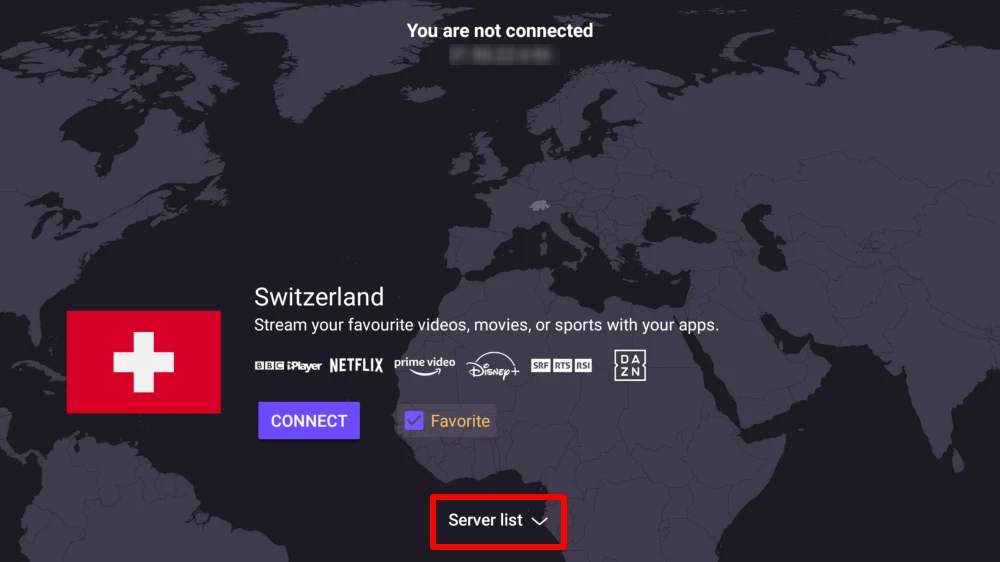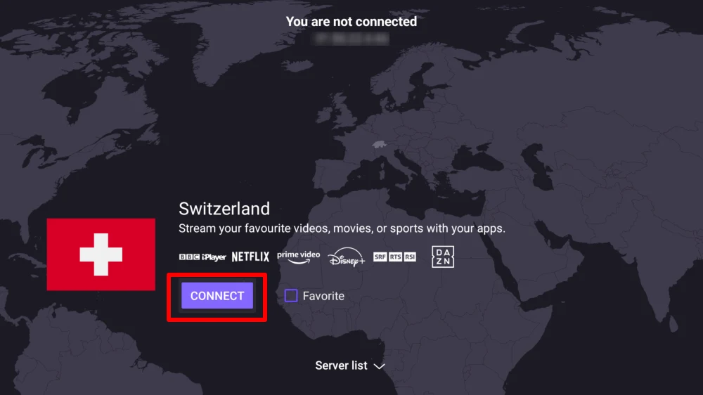 Use your remote to navigate between countries and connect to a server by selecting Connect.